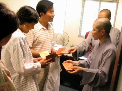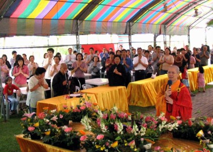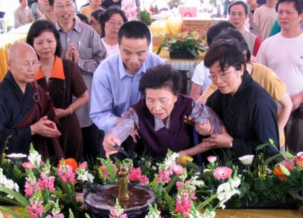 2005.05.08 本院舉行一年一度的浴佛法會,鄉親、護法三百多人參加普佛、上供、浴佛大典,場面熱鬧而溫馨。觀音鄉長張永輝先生與夫人王瑞香女士,一早即前來參加普佛,鄉長夫人並參加皈依典禮,正式皈依三寶。郭榮宗立委與邱垂貞政務委員亦於午供前趕來參加浴佛。為共體佛陀慈憫眾生的大悲大願,本次浴佛法會將循往例,以信眾之捐獻,扣除法會開支之後,悉數捐作觀音鄉之急難救助基金。 |