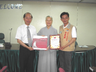 2005.05.03 為喚起社會「尊重生命、愛護動物」,在高雄市議員郭建盟的促成下,三日下午高雄市教育局局務會議中,關懷生命協會秘書長傳法法師代表協會,捐贈《小白、阿花何處去?關懷流浪動物教師手冊》五百冊給高雄市各國小,由教育局鄭進丁局長接受贈書,希望藉由這本針對教師設計的流浪動物手冊教材,落實在國小生命教育課程。捐贈《小白、阿花何處去?關懷流浪動物教師手冊》(左起:高雄市教育局鄭進丁局長、傳法法師、高雄市議員郭建盟先生。中華日報記者王正平攝)。 |