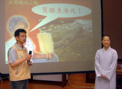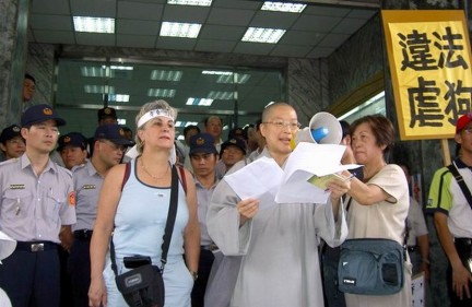 2005.06.01 上月20日中天新聞獨家報導基隆市清潔隊以殘暴的拖、拉、吊方式捕犬,引起動保界震怒,今日上午百餘位動保人士至基隆市遊行抗議。關懷生命協會秘書長傳法法師擔任召集人之一,遊行結束與諸代表面見基隆市長許財利,要求嚴懲虐待動物的捕犬員,並對基隆市流浪動物處理措施提出多項建言。 |