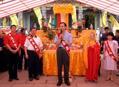 2005.05.28 朱立倫縣長(中)於午供大典時來到會場致詞(左一:吳宗憲縣議員;左二:觀音鄉張永輝鄉長)。 |