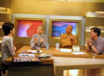 2005.06.07 東森新聞s台「青蓉k新聞」節目,為印順導師作一小時的專題報導錄影,由東森新聞主播林青蓉小姐主持,邀請傳道法師、昭慧法師與江燦騰教授談印順導師的德學成就,及其思想對當代佛教與社會的影響,並請昭慧法師談述印順導師的生活點滴(左:主持人林青蓉小姐,右二:傳道法師,右一:江燦騰教授)。 |