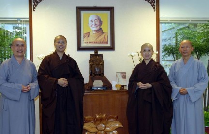 2005.06.27 新竹法源寺住持寬謙法師與真理法師,在論玄師父陪同下蒞院,特致贈本院一尊寬謙法師令尊楊英風教授之「印順導師銅雕」。該銅雕係本作品之原始尺寸,後來放大製作,供奉於福嚴精舍。所贈與本院之銅雕編號為2號,1號(即原件)陳列於楊英風美術館。安置印順導師銅雕之後,於印順導師紀念室合影留念(左:寬謙法師,右:真理法師)。 |