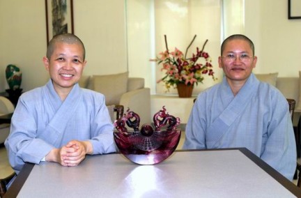 2005.07.03 下午,悟殷法師蒞院,並帶來研究部93學年《俱舍論》課程學生共同張羅的一份賀禮:琉璃工房的「青雲平步」,祝賀昭慧法師升等教授。 |