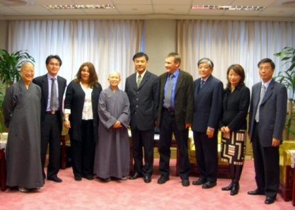 2006.02.23 上午10:00,昭慧法師與關懷生命協會常務理事張章得先生、秘書長傳法法師、acap台灣計劃執行人miss rebecca chen,以及國際野生動物保護組織的 wildaid (u.s.) mr. peter knights 與 co-habitate (u.k.) miss susie watts 等一行人,在鄭運鵬立法委員陪同下,連袂至農委會拜會新上任的蘇嘉全主委,向主委分析:台灣是全球唯一將鯨鯊當作「食物」的國家,濫捕導致鯨鯊瀕危,也嚴重影響台灣的國際形象,因此敦請政府將鯨鯊列為保育類動物,改而效法澳洲,開發鯨鯊生態旅遊( 左起 : 傳法法師、鄭運鵬立委、miss susie watts、昭慧法師、蘇嘉全主委、mr. peter knights、高志明國策顧問、rebecca小姐、張章得居士)。 |
