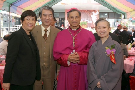 2006.02.28 上午,昭慧法師應洪山川神父之邀,與性廣法師一同至嘉義市輔仁中學文康中心,參加洪神父晉升天主教嘉義教區主教的祝聖暨就職大典。隆重莊嚴的祝聖彌撒,由臺灣樞機主教單國璽主祭,他為洪主教授與權戒、禮冠與牧杖,然後攜洪神父登上新主教寶座。教廷駐華代辦安博思以國台語雙聲帶宣讀教宗任命狀,贏得全場熱烈的掌聲。呂秀蓮副總統、民政司黃麗馨司長、外交部歐洲司王豫元司長均到會祝賀。午餐之時,洪山川神父(右二)與昭慧法師、許景漢伉儷合影(許景漢先生(左二)係昭慧法師於中央電台合唱團時代之團友,曾為弘一大師作曲的「三寶歌」配以四部合唱之和聲,和弦極為莊嚴感人)。 |