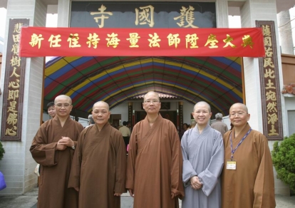 2006.03.05 上午,台中縣霧峰護國寺舉行前任住持如虛長老退居,新任住持海量法師陞座大典。由於如虛長老自中風後行動不便,故由真華長老代為送位。如虛長老坐著輪椅全程觀禮。諸山長老、法師、居士數百人雲集參與盛會。昭慧法師與性廣法師亦應邀共襄盛舉。於護國寺山門口合影留念(左起:常光、慧理、海量、昭慧、智願法師)。智願法師擔任本次大典總幹事。 |