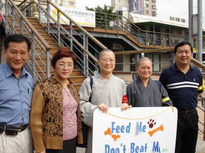 2006.03.16 本日,本院學生傳法、心瑞、心皓、心慈法師與德風,以及關懷生命協會義工出發至台中參加抗議虐犬游行。傳法法師及其他五位動保代表,與市政府主任秘書劉邦裕展開7大訴求的協商會議。劉邦裕針對狗吃狗事件,提出10項具體回應(右起:曾朝榮市議員、傳法法師、心慈法師、邱素貞市議員與陳仁榮里長伉儷)。 |
