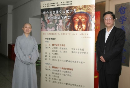 2006.04.11 昭慧法師應王雷泉教授之邀,在上海復旦大學舉行的演講與專題討論會擔任主講人。兩人在復旦哲學系辦公室門口的演講會海報前合影留念。 |
