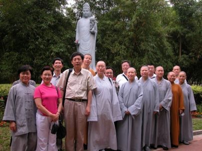 2006.05.25 第六屆導師思想研討會主辦單位安排大陸來賓,展開為期四天的參訪之旅,參訪印順導師駐錫道場與慈濟、法鼓等人間佛教道場。上午參觀法鼓山,中華佛學研究所李志夫所長、陳秀蘭秘書與僧伽大學常諦法師、法鼓山常度法師(前排中)已於教育行政大樓二樓圓廳外迎接來賓。一行人先上五樓海會廳,李所長向來賓致歡迎詞,然後觀賞法鼓山簡介影片。接著參觀教育行政大樓、圖書資訊館、大雄寶殿、大悲殿與校史館,並於齋堂享用豐美的自助餐。來賓對全山的建築與設備,以及其中所蘊涵的人文理念,甚為讚歎。特別是大悲殿的觀音菩薩聖像,面微左側,彷如若有所思地在聆聽世音,後面是潺潺瀑水,宛若潮音。從殿內到殿外,分別題辭曰:入流亡所、大悲心起、觀世自在,意境高超,寧靜致遠。 |