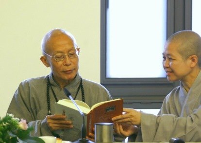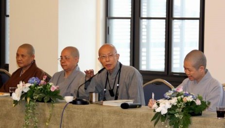 2006.05.30 聖嚴長老會晤比丘尼法師,並於座談會中致詞(左起:普暉法師、悟因法師、聖嚴法師、昭慧法師)。