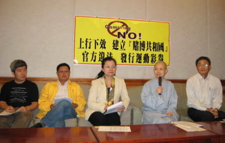 2007.10.19 本日上午,經關懷生命協會林憶珊、王萱茹與反賭博合法化聯盟陳悅萱之籌畫聯繫,於立法院中興大樓1樓103貴賓室,以「上行下效,建立『賭博共和國』;官方違法,發行運動彩券」為題,召開記者會。昭慧法師由耀行法師、彰妙法師及德風陪同,抵達立法院中興大樓,接受法界衛星電視台之採訪後,十時正即與立法委員田秋堇共同召開記者會,出席人員則有「反賭博合法化聯盟」發言人葉智魁教授、勵馨會執行長紀惠容女士、台灣環境保護聯盟秘書長何宗勳先生以及台灣勞工陣線秘書長孫友聯先生。本次召開此記者會,強烈反對官員以違法手段發行運動彩券,並於記者會中提出三大訴求、二項宣告。 |