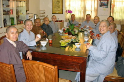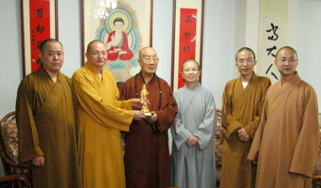 2007.10.25 下午,四位來自中國的比丘法師--宏度(中國佛教協會政策研究室副主任)、曙正(中國佛教協會港澳台聯絡辦公室主任)、賢禪(北京龍泉寺監院)、印照法師(中國佛學院中觀講師)蒞臨本院參訪,在參觀過導師紀念室之後,於嵐園與昭慧法師座談。四位青年法師來台兩個月於法鼓研修學院參學,並參觀台灣幾所重要的佛學院、佛教大學。他們甚為讚嘆昭法師之唯識學著作,昭法師乃將其《唯識學探源》、《佛教規範倫理學》專書贈與之。 談話之間,得知他們下一站將到中國佛教會拜會淨良長老,而時間恐有所延遲,昭法師乃於電話中向長老致歉,長老力邀昭法師一同前往,昭法師乃欣然赴會。長老於中國佛教會客廳接見,言談中,長老頻頻表達對兩岸佛教之關心,並極為推崇性廣法師之禪學思想與禪觀教學。晚間,長老慈悲於鈺善閣款待大家(左起:曙正法師、宏度法師、淨良長老、昭慧法師、賢禪法師、印照法師)。 |