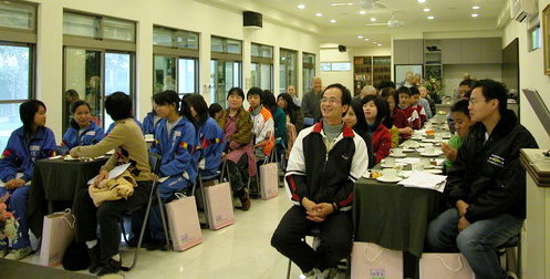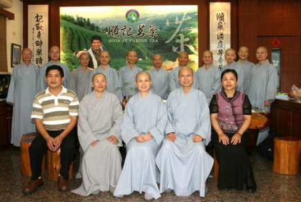 2007.10.28 學團師生至鹿谷參觀悟殷法師的山居茅蓬,然後轉到順記茗茶公司參觀。創設順記茗茶公司的錢芳照居士係德松法師表弟,年輕有為,擔任製茶總監,偶亦應邀擔任國際茶賽評審委員。其茶葉產品在海峽兩岸都獲得好評。是日錢居士伉儷不但以好茶款待,而且贈送多盒茶葉給學院常住與法師們。學團師生於順記茗茶與錢芳照居士伉儷(前排左、右)合影留念。 |