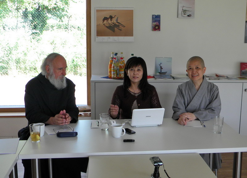 在本篤修會四塔出版社會議室,昭慧法師與古倫神父展開宗教對話。(100.6.7,左起:古倫神父、口譯吳信如、昭慧法師)