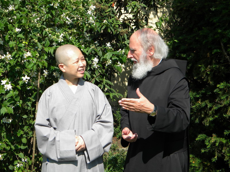 在本篤修會的庭園中,古倫神父與昭慧法師相談甚歡。(100.6.7)