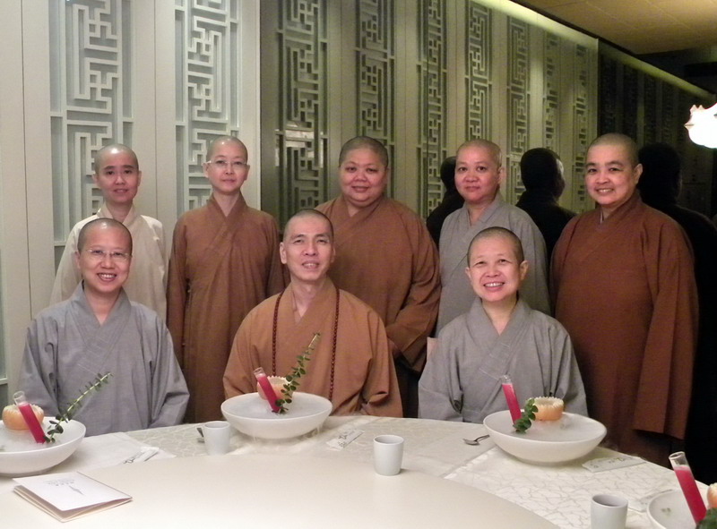 9日晚間,明義法師宴請昭慧、性廣法師。(100.7.9,前左起:性廣、明義、昭慧法師,後左起:汶豪、善森、汶傑、永佳、妙詮法師)