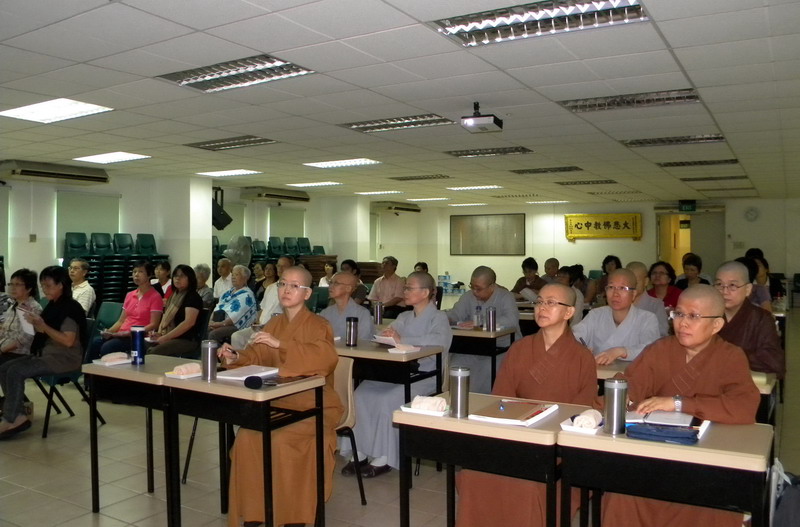前來參加的法師、居士有七、八十人之多,大家聚精會神聆聽。