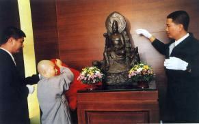 道明法師並代表傳悔長老,為法印樓一樓門廳中,學院精神象徵的「善財禮觀音」銅雕揭幕。該銅雕係楊英風居士作品。 |