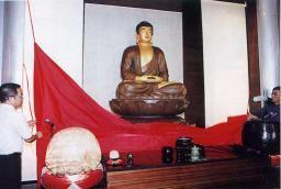 慈祥莊嚴的釋迦佛銅像,係藝術家吳進生居士作品,恭奉於大殿之中;張章得先生(右)、吳東霖先生(左)為釋迦佛像揭幕。 |