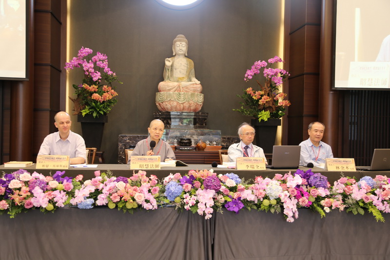 104.5.30 第二場論文發表會a場次。(左起:發表人根瑟馬庫斯教授、發表人昭慧法師、主持人李瑞全教授、發表人林金木教授) |