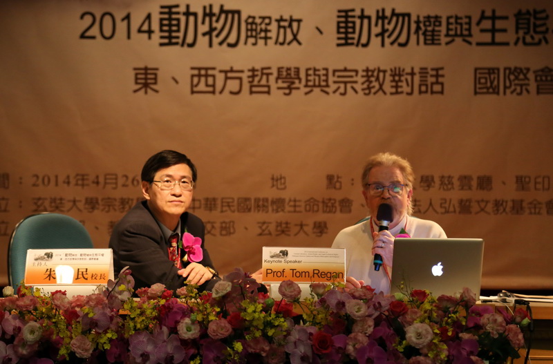 103.4.26 第二場專題演講,tom regan教授(右)主講「『動物權』之哲學論述──什麼是動物權?動物權為何重要?」。(左:主持人朱建民教授) |