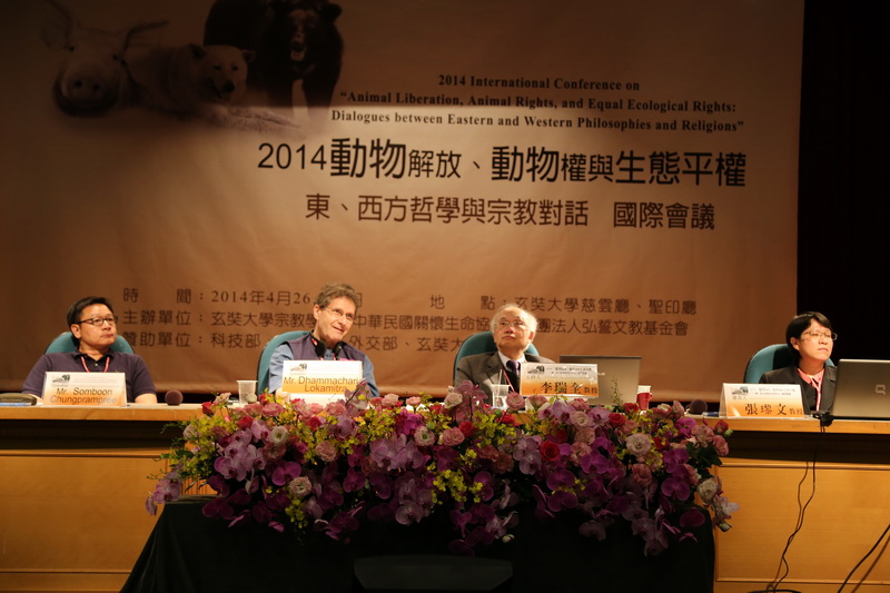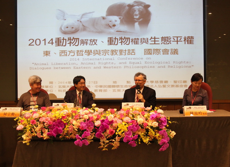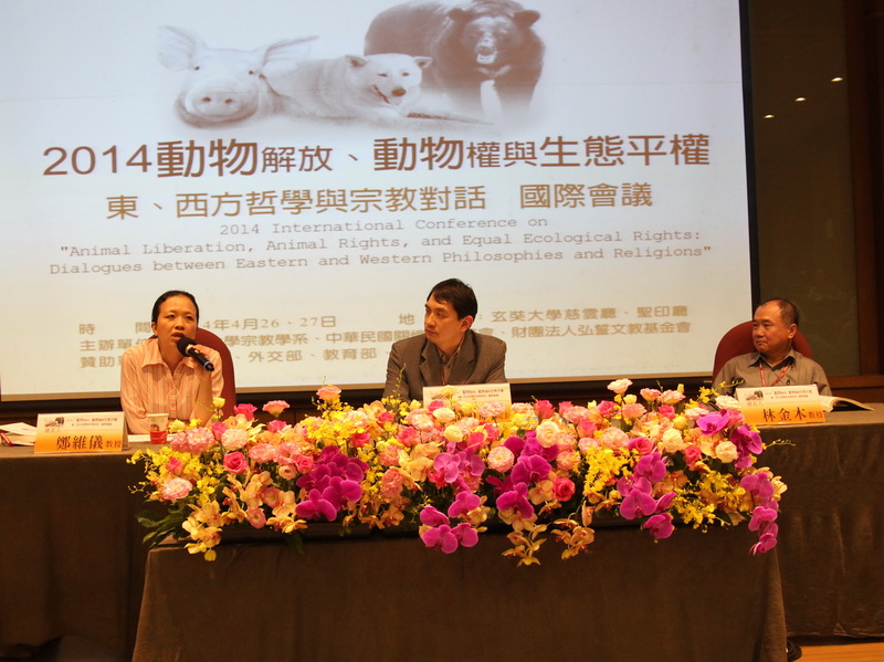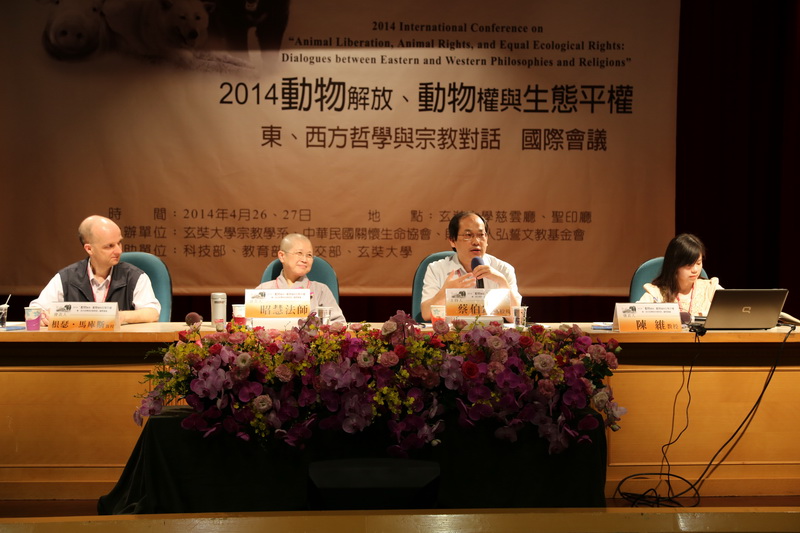 103.4.26 假玄奘大學舉辦「2014動物解放、動物權與生態平權──東西方哲學與宗教對話」國際會議,上午八時半舉行開幕典禮,玄奘大學林博文副校長(中)致詞。 |