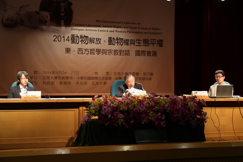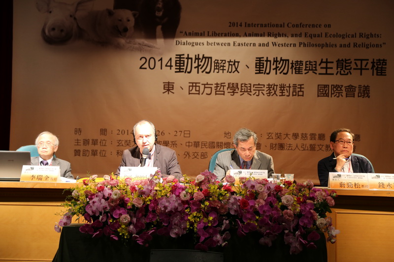 103.4.27 第三場論文發表會a場次。(左起:發表人李瑞全教授、發表人jean-luc guichet教授、主持人葉海煙教授、代蔣勁松教授發表的錢永祥教授) |
