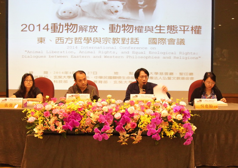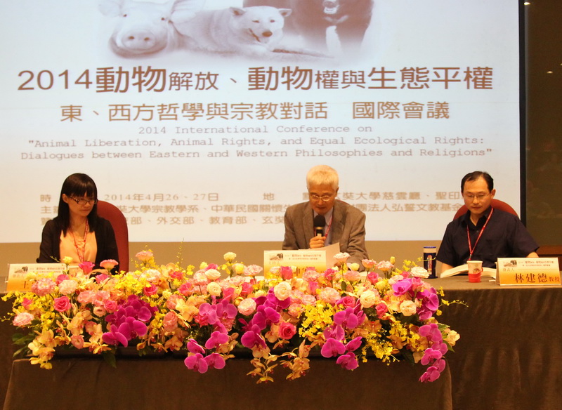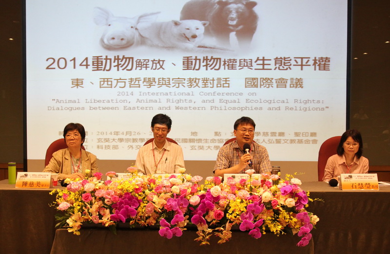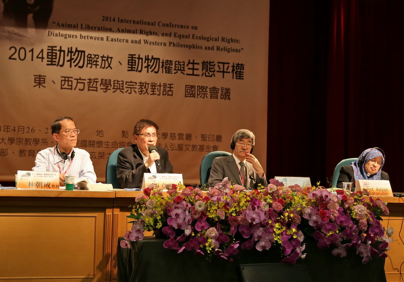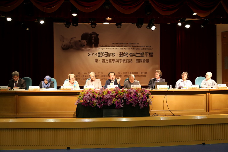 103.4.27 最後一場圓桌論壇。(左起:嚴一峯處長、azizan baharuddin教授、tom regan教授、peter singer教授、錢永祥教授、sulak sivaraksa教授、jörg luy教授、裴家騏教授、昭慧法師) |