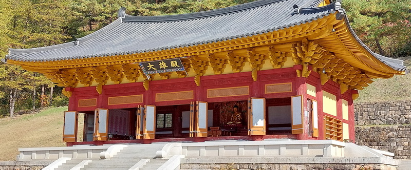 111.10.28 淨土禪修中心宏偉的大雄寶殿,與中國佛教略有不同的是,牌匾直書「大雄殿」三字。 |