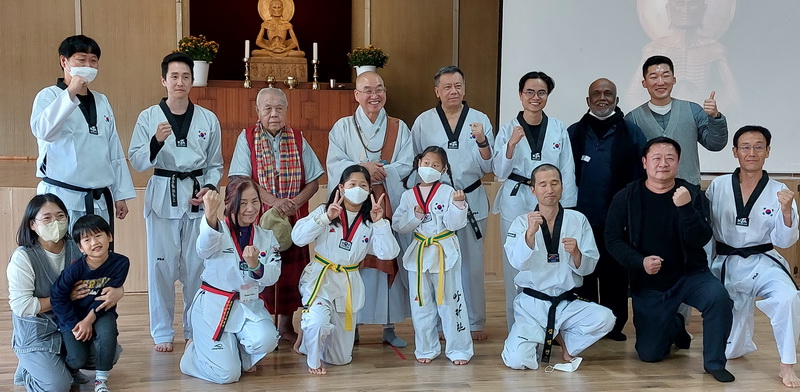 111.10.28 主辦單位淨土社展示韓國傳統文物與服飾、韓國泡菜、人造花與國術,歡迎會眾實地穿戴、製作、演練,稍事體驗韓國的特色文化。此為佛陀苦行堂裡的韓國國術體驗。 |