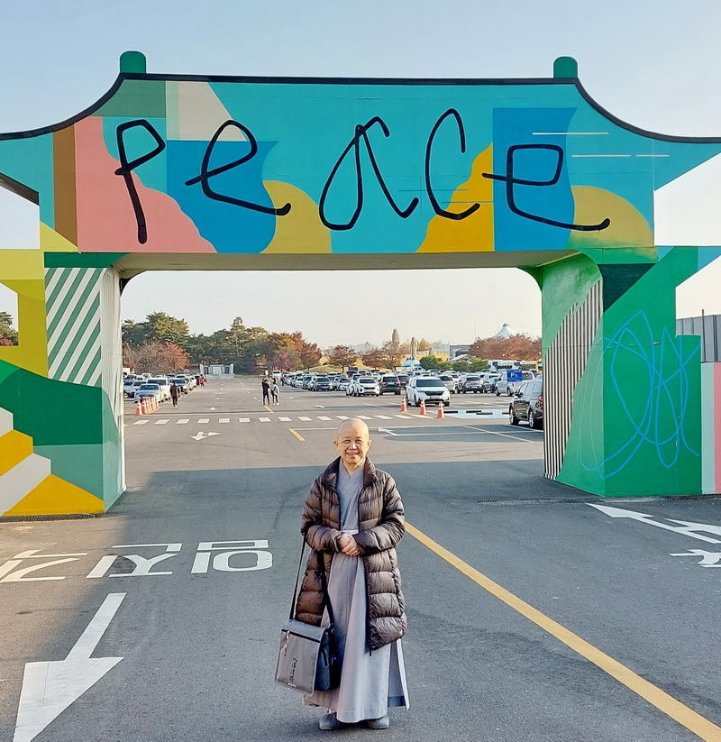 111.10.29 昭慧法師攝於板門店南北韓交界處和平公園牌坊下。(陳枚槐攝) |