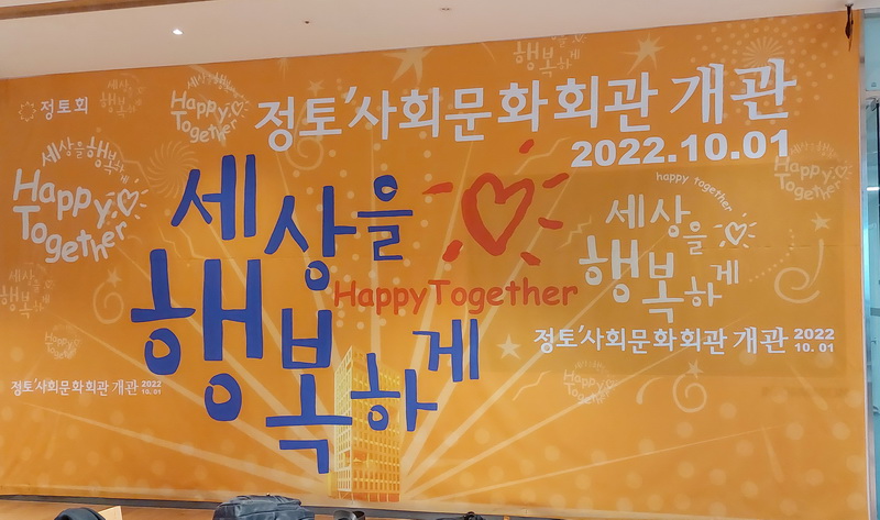 111.10.29 在淨土中心B2休憩區,寫著Happy together與2022.10.1的大看板。 |