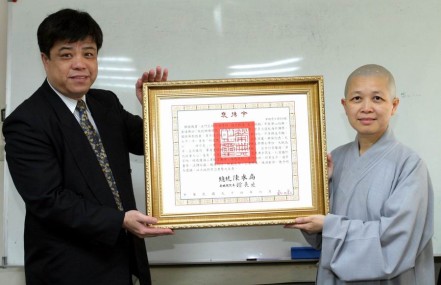 94.6.9 總統府第二局陳烯堅副局長至輔仁大學宗教研究所教室,將頒贈印順導師的總統褒揚令,親自交給昭慧法師。