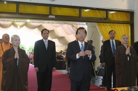 94.6.10 上午,陳水扁總統在總統府游錫堃秘書長(後立者)陪同之下,蒞臨福嚴精舍,向印順導師蓮位上香致祭。