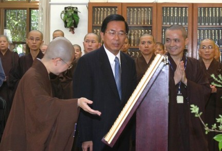 94.6.10 厚觀法師(前右)與昭慧法師(前左)請陳總統觀看陳列於香案前的總統褒揚令。