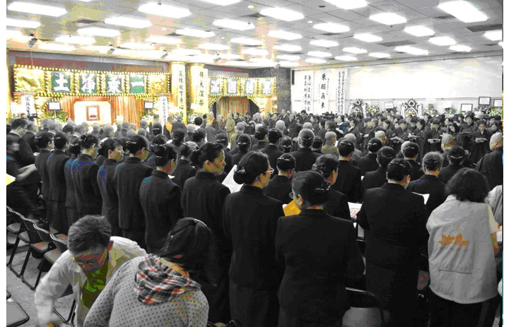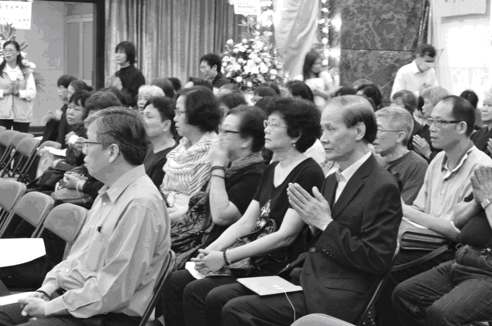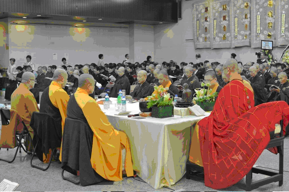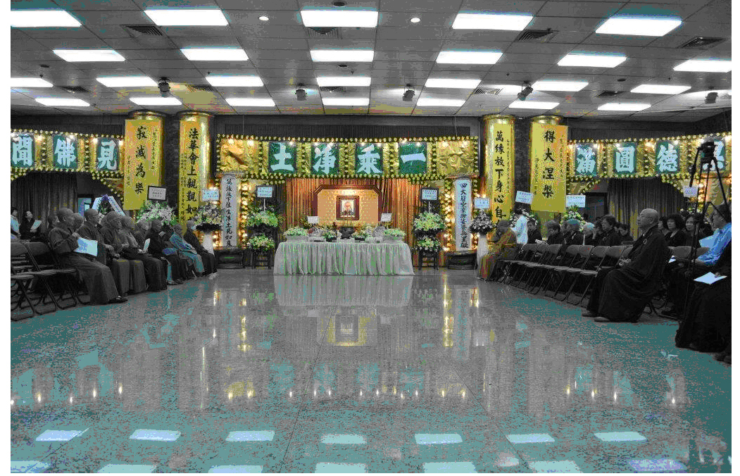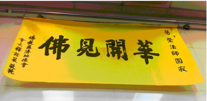 偌大的世界堂,不但座無虚設,工作人員更要勤加椅子,讓不斷進來的賓客有座位可坐。妙華會友師兄,負責招待來賓、維持秩序、拍攝場景;其他各個會眾師兄,忙不迭快快穿上海青戒衣,準備就緒。筆者估計,到會人數超過六百人以上,交談之聲不絶,但卻非嘈雜喧嘩,熱鬧而無煩擾之聲。會堂兩旁,掛上團體、同門、弟子、信眾所送布幔: