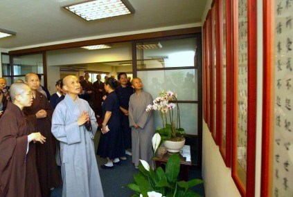 接著昭慧法師向上人介紹陳列於導師紀念室中的兩件墨寶——一件是導師所書「勝鬘經」條幅,一件是聖嚴長老書贈昭慧法師的導師法語——「本著精衛銜石的精神,做到哪裡,哪裡就是完成,又何必瞻前顧後呢?」上人不禁讚歎:「你這裡有好多寶物啊!」