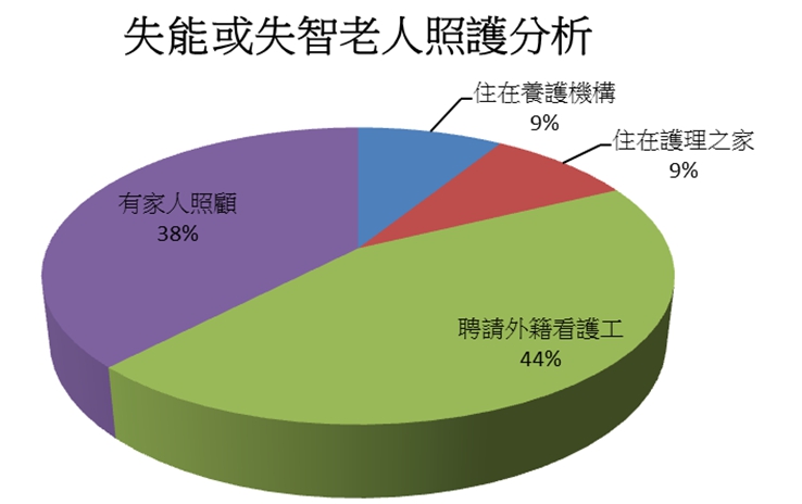 目前,台灣2300萬人中,約11%、276萬名是老人,這些老人中又有14%、約46萬人屬於失能或失智;其中,有4萬人住在養護機構,近4萬人住在護理之家,高達近20萬人聘請外籍看護工,剩下17萬老人,幸運的有家人照顧,還有部分根本乏人照顧者。值得注意的是,外勞輸出國若減少或取消名額,這20萬的龐大照護缺口,將落在誰身上?