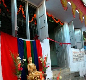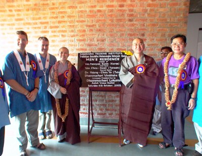 之後,由法輪法師與昭慧法師為命名「弘誓樓」的男眾宿舍剪綵。本次世友先生原本是安排法輪法師剪綵,但法輪法師見昭慧法師在旁,堅持法師與其一同剪綵。世友先生特為此男眾宿舍命名為「弘誓樓」,以四弘誓願自期,並以茲紀念與弘誓學院間的道誼。世友先生並說道:宿舍的捐款大都來自台灣的信眾,非常感恩台灣信眾對印度佛教復興運動的支持。然後,世友先生一一介紹四位貴賓,並請其致詞。