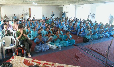上午7:30,一行人出發前往龍樹學院女眾部。他們特別於沙地上,以彩色顏料彩繪圖案,歡迎嘉賓,其圖案色彩繽紛,非常特殊。