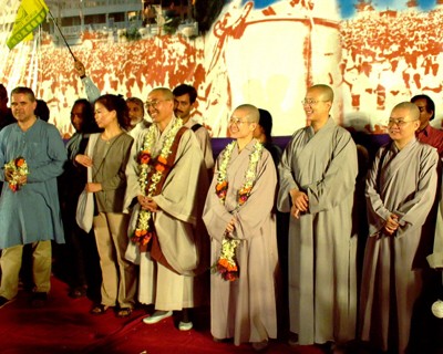92.10.4 百萬人齊聚龍城的印度佛教復興 47週年慶,在佛教復興廣場(Deeksha Bhoomi)高台上,昭慧法師與法輪法師(左三)分別致詞