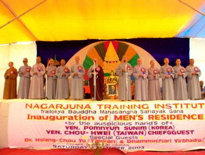 由世友先生陪同,離機場前往Centre Point飯店放置行李後,隨即搭乘巴士於11:40抵達龍樹學院,參加上午11:00龍樹學院(Nagarjuna Institute)所舉行的印度佛教復興運動慶祝大會暨男眾宿舍落成典禮(Inauguration of Men's Residence)。一行人先至安貝卡博士像前獻花致敬,然後再至落成典禮廣場觀禮。本典禮,由世友先生擔任主席,龍城佛教復興運動負責人Dhammachari Vivekaratna為主持人、彌勒先生(Dhammachari Maitreyanath)將英文翻譯成當地馬拉地語(Marathi),共有英國倫敦大悲基金會(The Karuna Trust)主席Dhammachari Virabhadra、韓國淨土會(Jung To Society)指導法師法輪法師(Ven. Pomnyun Sunim)、昭慧法師與游祥洲教授四位貴賓蒞臨。典禮開始,由世友先生與四位貴賓向佛像、龍樹菩薩像及安貝卡博士像獻花、獻香禮敬,唱頌三歸五戒與讚佛曲,十三位台灣法師則在昭慧法師帶領下,三稱佛號與唱頌心經,接著馬鳴合唱團獻唱自作詞曲歡迎嘉賓(? 酉齔陔蘇O二世紀印度有名的文藝大師,以音聲動人的力量,感化人學佛,此合唱團命名「馬鳴合唱團」,深有寓意)。