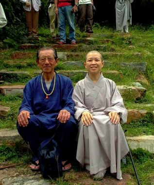 昭慧法師與《印度佛跡巡禮》作者前田行貴教授於阿難尊者修行洞窟前之山道石階上合影。