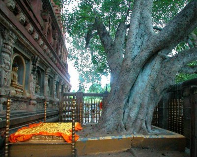92.10.7 佛陀成道處之菩提樹與金鋼座,左側為大覺寺壁佛雕。