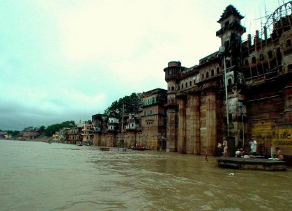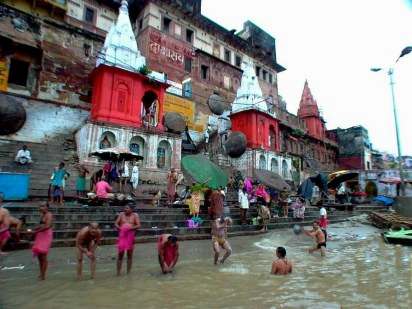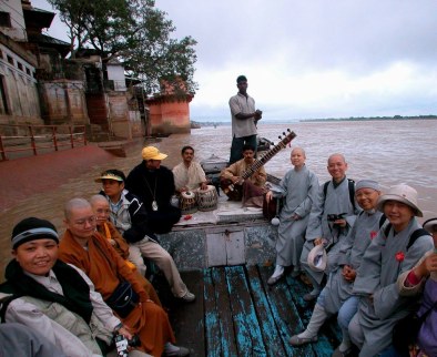 近岸邊,有許多人脫衣半身或全身浸入水中,或雙手掬取恆河水祝禱。河岸邊,有許多行宮,用以提供皇族來恆河朝聖時休憩用。也有火葬場、稅捐處等。領隊李德用先生請了兩位樂師在船上演奏,讓我們體驗不同的印度音樂。這日清晨,天色濛濛,水流湍急,無法見到恆河日出景象,也無法到達恆河對岸(西岸)觀賞。團員採集恆河沙,用以紀念或與其他佛友結緣。