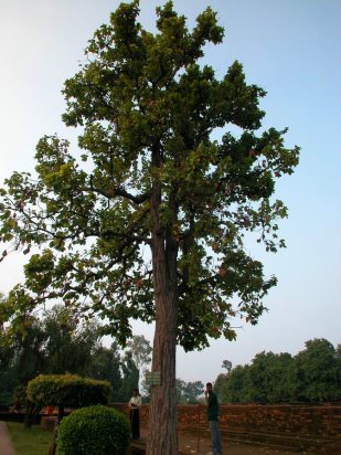 92.10.10 寺前的娑羅樹幹中段開叉分枝,冥合佛陀涅槃於娑羅雙樹的意境。原樹已毀,此樹由前田行貴教授種植,樹齡約四十年。