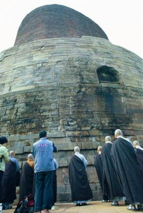 上午8:40抵達五比丘迎佛塔(Chaukandi Stupa)巡禮。後約三分鐘車程處,是鹿野苑(Sarnath),這是世尊初轉法輪處,佛陀在此處宣說四諦三轉十二行相。在此處,參訪佛陀初次說法之平台、阿育王為紀念佛陀初轉法輪所建之紀念塔與阿育王石柱(只剩柱子,柱頭的四頭獅子像在「鹿野苑考古博物館」)。一行人在昭慧法師帶領下,從佛陀初次說法之平台起念佛號右繞三匝、早課。