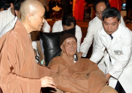 醫師們推著輪椅,陪同導師參觀「法影一世紀——印順導師百歲嵩壽展」,證嚴法師親自導覽。