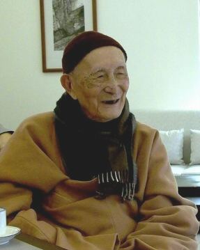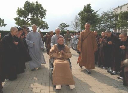 92.10.23 印順導師蒞臨本院,全體師生列隊合掌歡迎,導師微笑合十回禮。