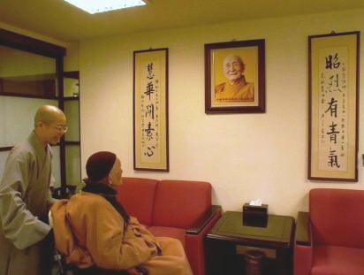 右面牆上是護持學院五千萬元建校經費的承天禪寺已故方丈傳悔長老法相,法相的左邊是現代禪李元松老師請小魚書贈的「當代人間菩薩,佛之俠者」,導師端詳良久,並垂詢「小魚是誰?」法師答是「名書畫家。」右掛馬來西亞繼程法師致贈法師的墨寶,題詞內容引自天童正覺禪師詩:「凜凜將軍令已行,八荒四海要澄清,提來劍氣干牛斗,洗蕩氛埃見太平」,法師逐句唸給導師聽,並笑稱:「氣魄真大,很嚇人的!」導師不禁莞爾。
